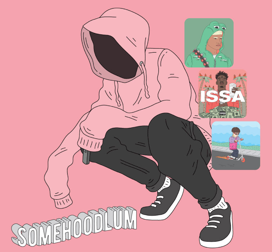 Somehoodlum is the internet’s favorite ghost, an artist who turned meme culture, hip-hop energy, and our Generation irony into a visual language of his own. You’ve seen his work everywhere: music videos, album covers, the famous PFP for Arsonic, and viral posts that blur the line between art and internet chaos.